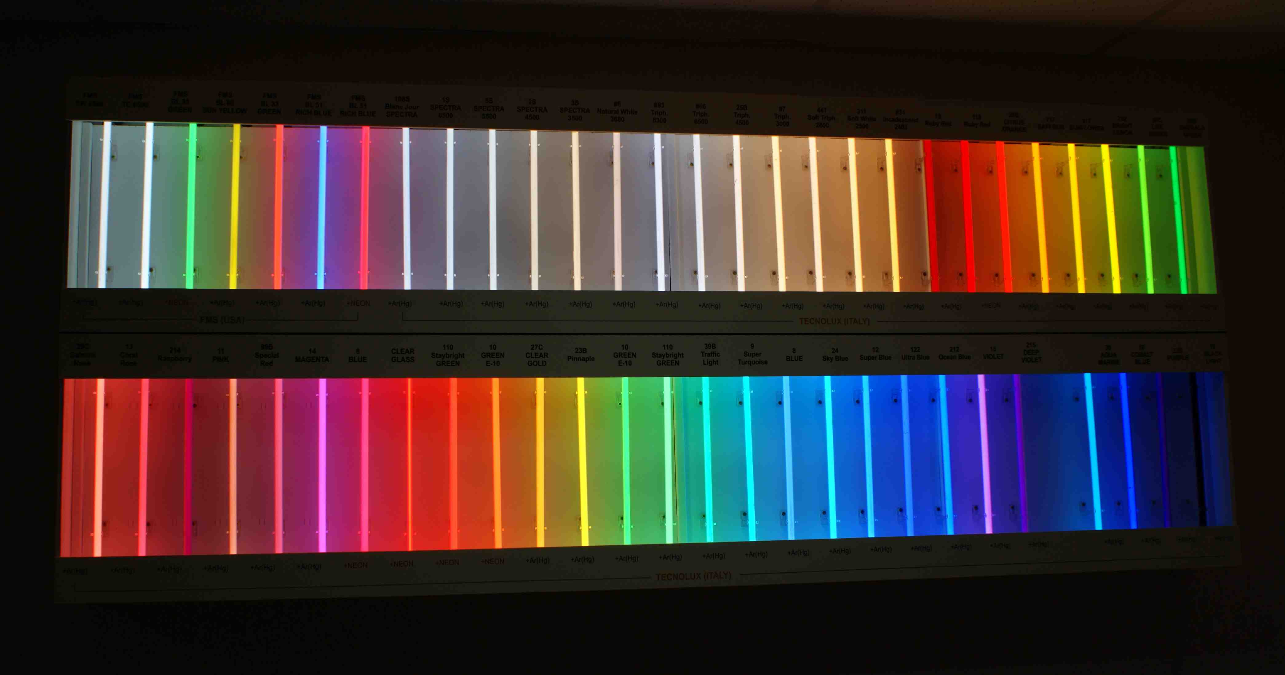 В стандартном варианте существует 2 газа неон и аргон. Неон имеет красно-оранжевое свечение а Аргон - голубое. Люминафор представляет собой химический состав. В зависимости от элементов входящих в состав, трубка заправленная газом начинает светится разными цветами.